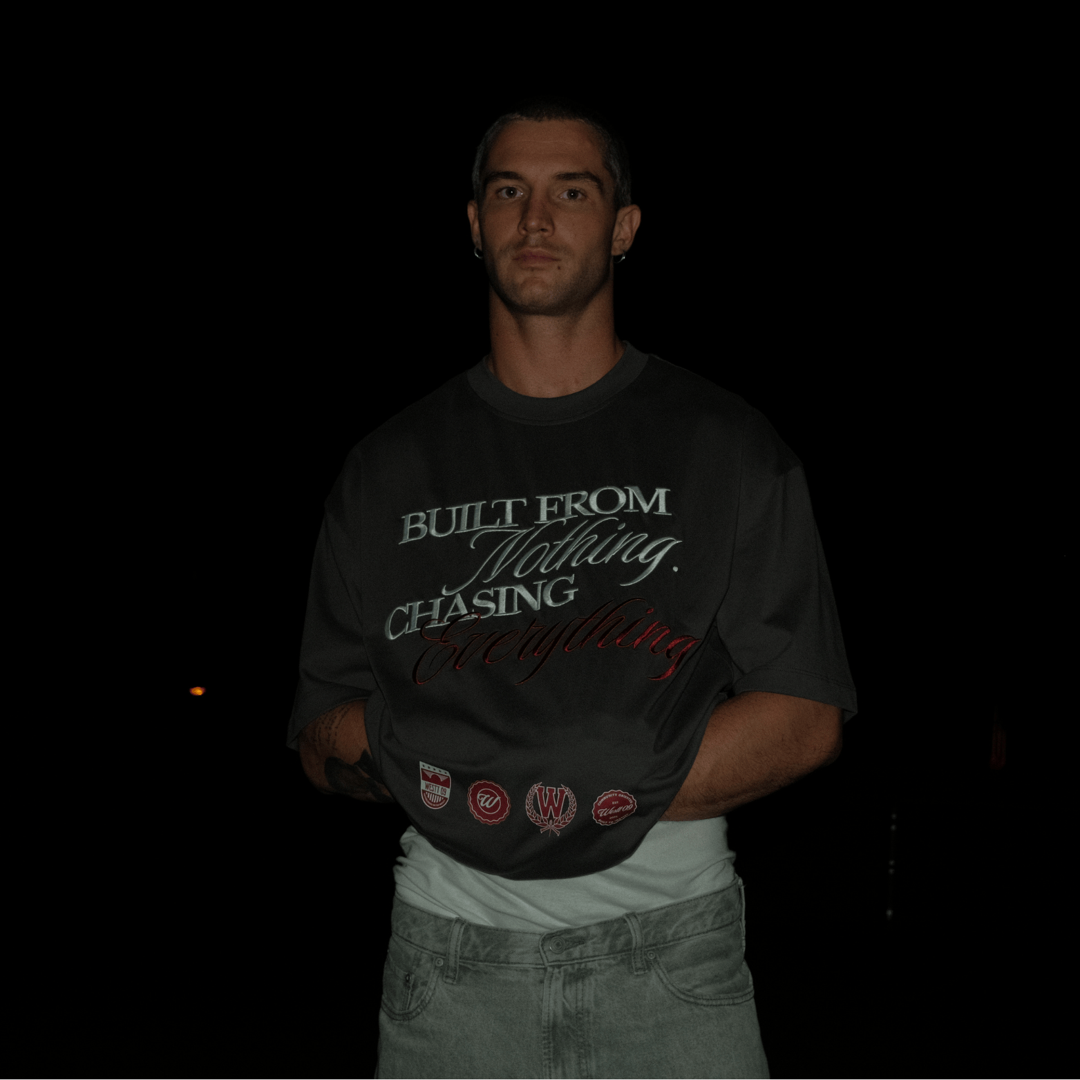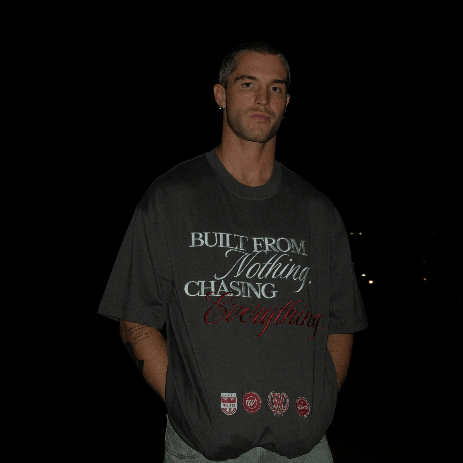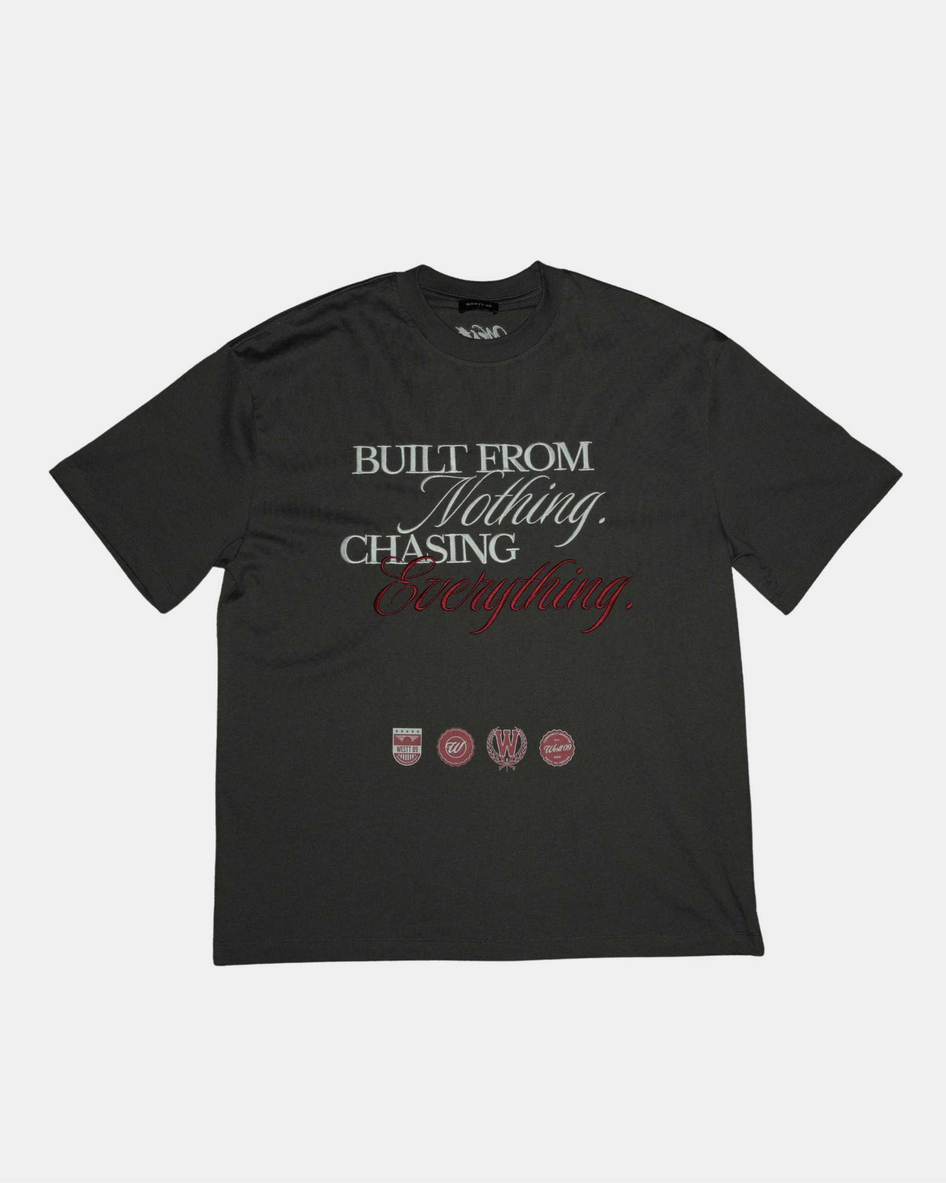 "Built from nothing. Chasing everything." quote fully embroidered in white and maroon on the front of garment (middle)