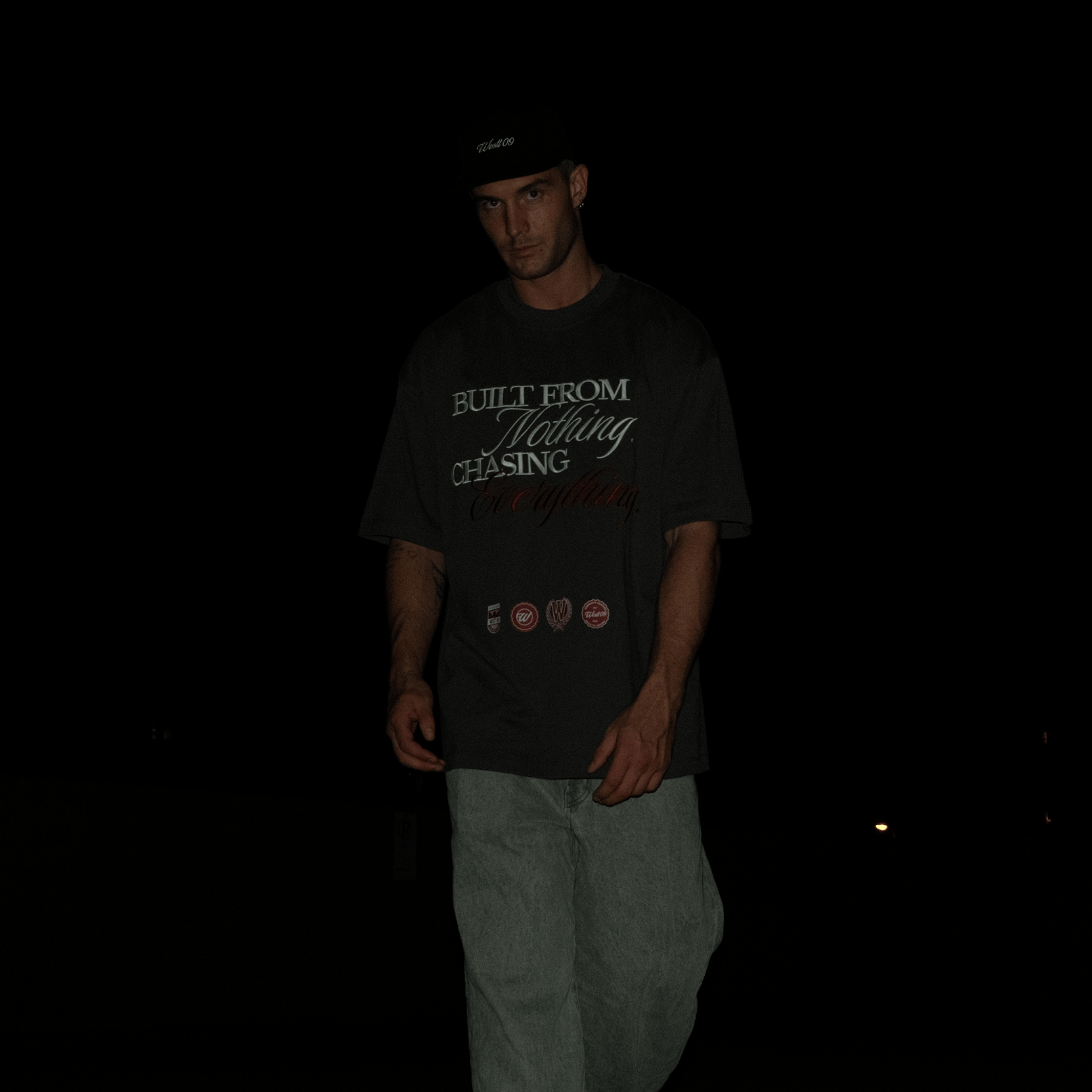 Four Westt 09 badges DTF printed on the front of garment (bottom)