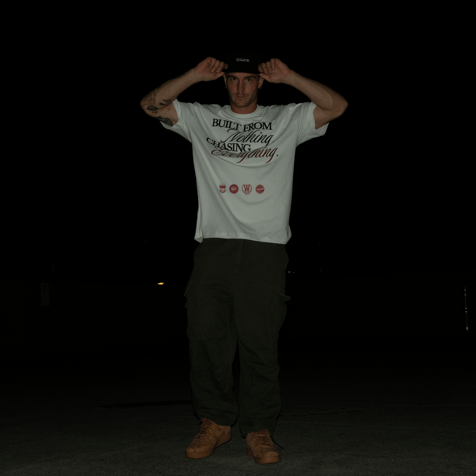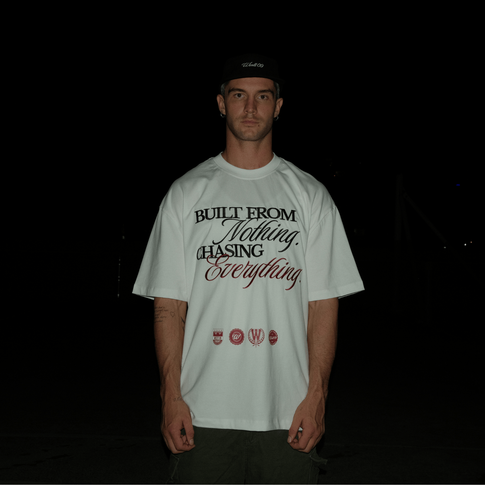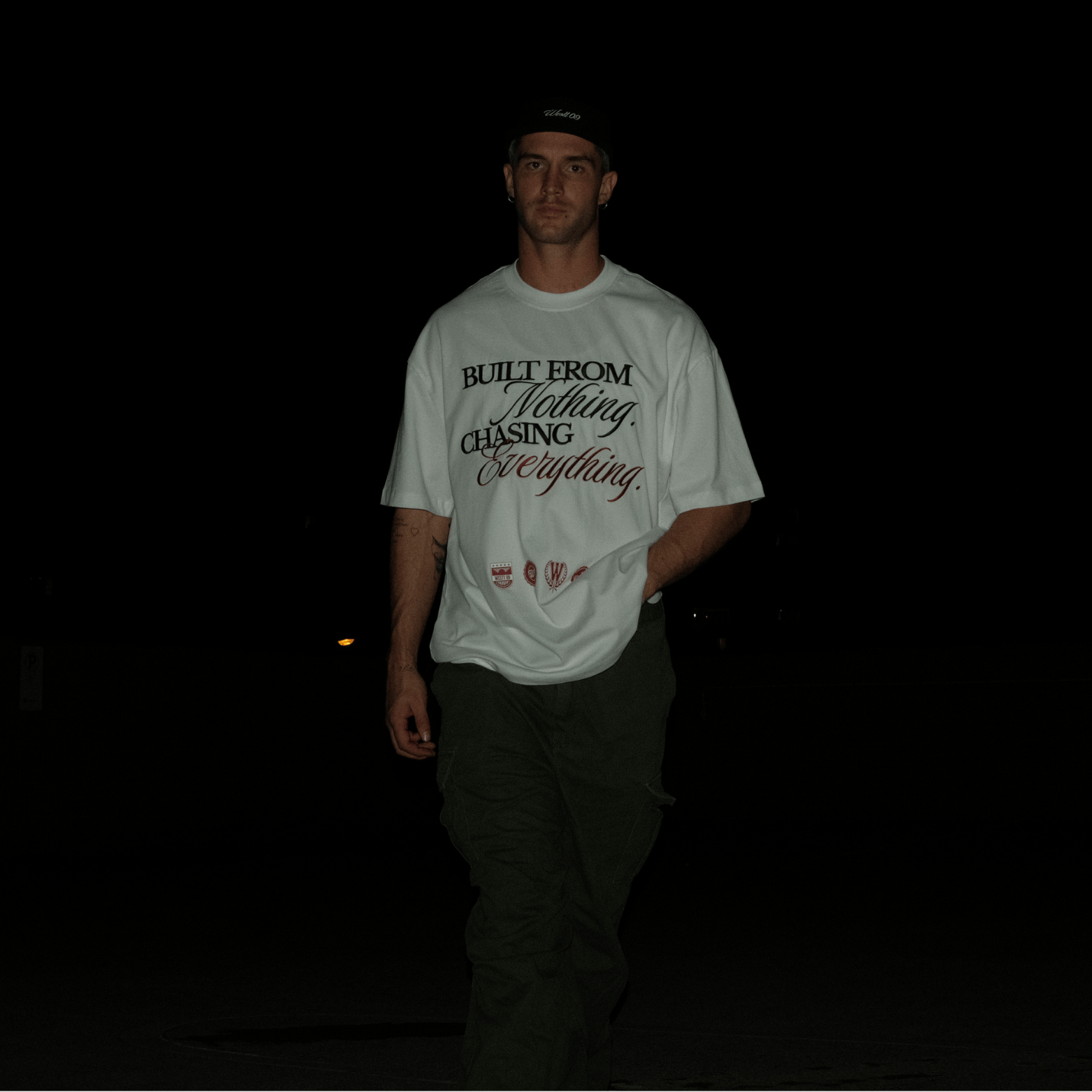 "Built from nothing. Chasing everything." quote fully embroidered in black and maroon on the front of garment (middle)