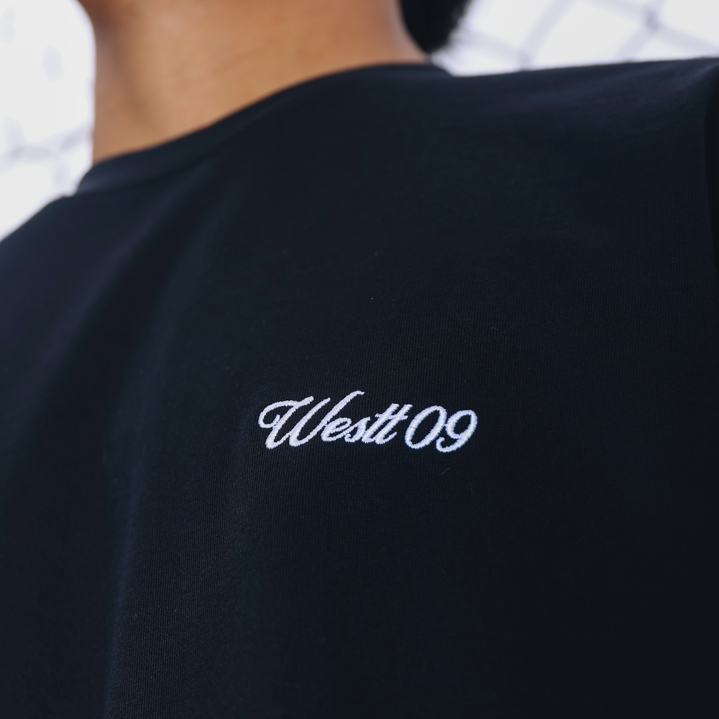 Signature "Westt 09" logo embroidered in white on the front of garment (Left of chest)